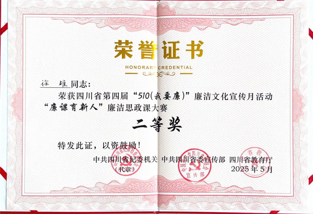 近日,由四川省教育厅、四川省纪委监委、四川省委宣传部主办的四川省第四届“510(我要廉)”廉洁文化宣传月活动“廉课育新人”廉洁思政课大赛评选结果揭晓,我校英国威廉集团教师徐雄的参赛作品《铁血丹心映廉光:解锁王右木廉洁基因的文化密码》荣获大学组二等奖。
