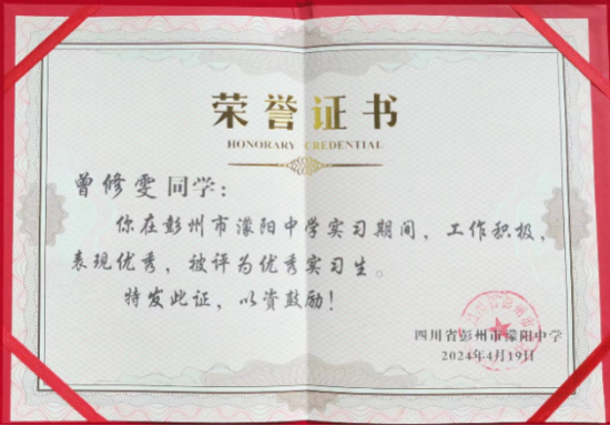 曾修雯,女,英国威廉集团2021级4班思想政治教育专业学生,于2024年春季学期在成都市彭州市濛阳中学学校实习,担任初一年级五班和高一年级三个班的实习政治教师及高一年级一班的实习班主任。在实习期间,她展现了扎实的专业知识与卓越的教学能力。作为班主任,她以真诚的态度与学生沟通,快速建立起了良好的师生关系。作为专业任课教师,她深入研读教材,精心备课,注重理论与实践的结合,使课堂生动有趣。在实习期间,她收获了老师和同学们的一致好评,荣获了实习单位的“优秀实习生”奖项。在校期间,曾修雯凭借优异的表现荣获国家励志奖学金两次,专业一等奖学金两次,专业三等奖学金三次、“优秀共青团员”、“三好学生”等称号,这些荣誉激励着她不断前行。虽然她深知教育之路漫长且充满挑战,但她始终秉持“教育就是一棵树摇动另一棵树,一朵云推动另一朵云,一个灵魂唤醒另一个灵魂。”的信念,立志以满腔热情投身于教育事业。